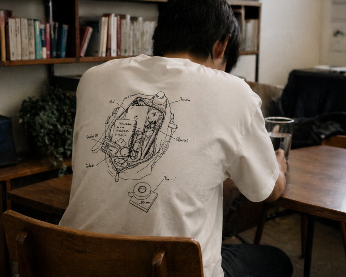 背面には、学生の鞄の中身をモチーフにしたグラフィックを大きくプリントしています。